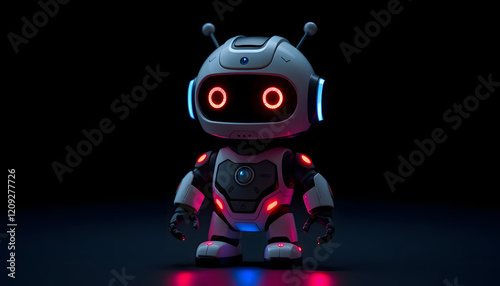 Adorable mini AI robot with glowing red and blue light effects, standing out against a dark background, symbolizing futuristic charm
