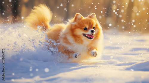 Adorable Pomeranian spitz running joyfully through snowy landscape