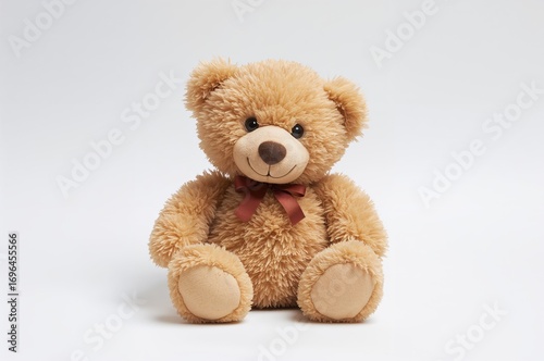 Adorable small teddy bear holding a camera against a plain white backdrop