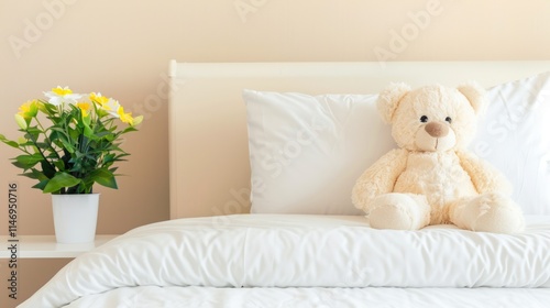 Adorable teddy bear on hospital bed with flowers in calm pediatric setting