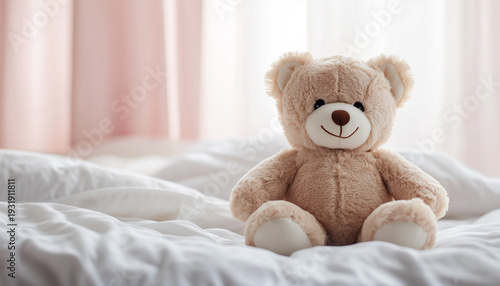 Adorable Teddy Bear Plush Toy on White Bed with Glamorous Pastel Blurred Background, Bright Cozy Nursery Advertising