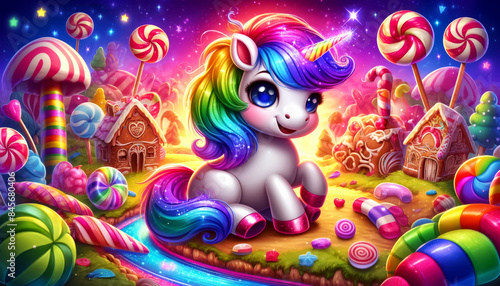 Adorable Unicorn in a Candy Wonderland with Gingerbread Houses