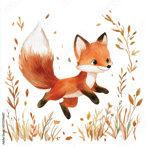 Adorable Watercolor Fox Leaping Amidst Autumnal Foliage