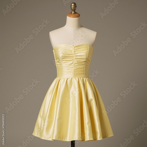 cute, yellow, short, strapless, dress, skirt, evening, party, cocktail, prom, mannequin, racked, fashionable, trendy, stylish, feminine, elegant, chic, glamourous, formal, fashion, apparel, clothing, garment, summer, spring, accessory, footwear, jewellery, make-up, coiffure, coiffure, night time, festive, fun, occasion, celebration
