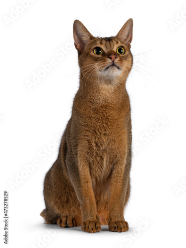 Adult Abyssinian cat sitting up and looking up above camera. Isolated on a white background.