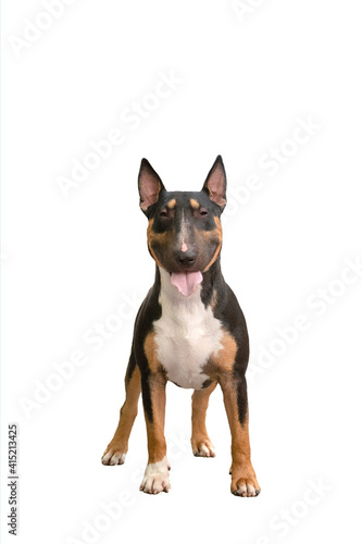 adult male bull terrier breed tricolor on a white background standing with his tongue out and smiling