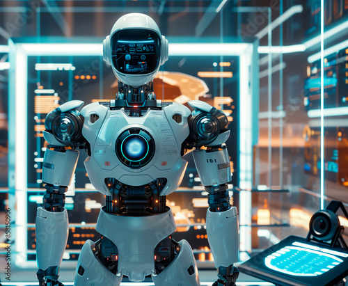 Advanced humanoid robot in a futuristic control room, surrounded by high-tech equipment and digital interfaces, illustrating advanced robotics and artificial intelligence