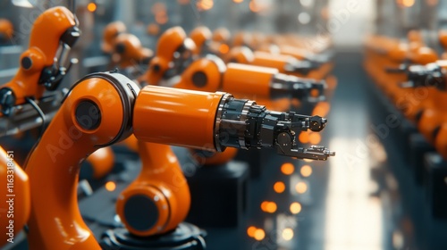 Advanced Industrial Robots in an Automated Manufacturing Environment Showcasing Precision Engineering and Innovative Technology with Bright Orange Color Scheme