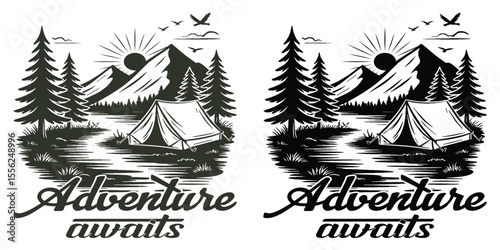 vector, summer, travel, nature, vintage, illustration, tree, cam, adventure, camping, tent, mountain, forest, river, sunrise, tree, wilderness, journey, explore, outdoors, scenic, wild, hike, trail, freedom, bird, expedition, landscape, camper, rustic, wander, peaceful, retreat, vignetting