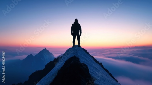 adventurer, summit, sunrise, mountain, silhouette, cloud, peak, exploration, nature, achievement, landscape, calmness, freedom, challenge, solitude, beauty, journey, horizon, adventure, height, climber, scenic, dawn, peaceful, accomplishment, inspiring, winter, snow, breathtaking, vista, sky, dramatic, rugged, elevation, serenity, thrill, remote, view, ascent, natural, life events