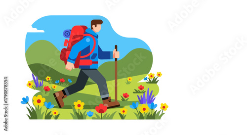 hiking, travel, adventure, backpack, nature, mountain, outdoors, trekking, landscape, flower, wanderlust, exploration, trail, summer, scenic, journey, illustration, cartoon, graphic, activity, freedom, wellness, view, flora, vibrant, field, scenery, environment, tour tourism, recreational, traveler, mountain, active, vegetation, springtime, ecological, colourful, climbing, leisure, peaceful, recreation, trek, explore