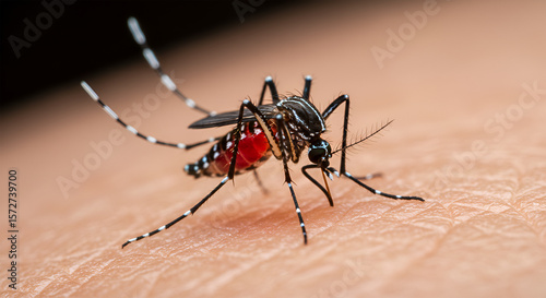 Aedes mosquito feeding on human skin, its abdomen full of blood, showing its striped legs and proboscis.