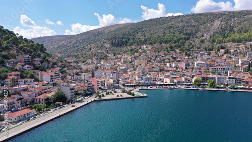 Aerial drone photo of iconic medieval castle built in small hill overlooking city of Vonitsa, Ambracian gulf, Greece