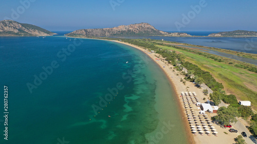 Aerial drone photo of iconic sandy beach of Divari (chrysi akti) with emerald sea near island of Sfaktiria in bay of Navarino, Messinia, Gialova, Peloponnese, Greece