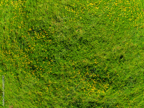 Aerial drone top down view on a green field with yellow summer flowers.