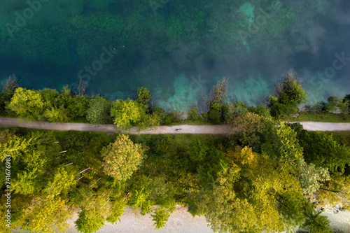 Aerial drone top view of emerald blue lake Bluntausee, Golling an der Salzach, Salzburg, Austria.