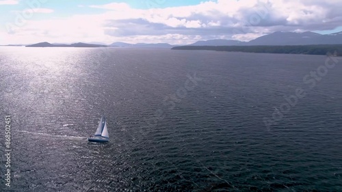 Aerial drone ultra wide photo of beautiful sailboat cruising deep blue open ocean Mediterranean sea.Aerial view of a motorboat circling in the ocean, Monaco.