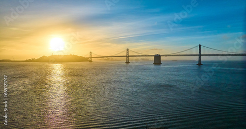 Aerial gold and blue sunrise over San Francisco Bay with sun coming over island and Oakland bridge