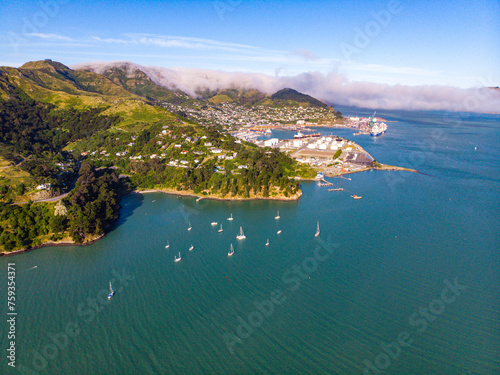 aerial panorama of cass bay, corsair bay, pony point and lyttelton, beautiful coast of new zealand south island, canterbury, christchurch area