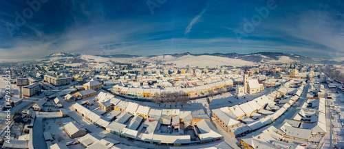 Aerial panorama of the of Podolinec town in winter, Slovakia