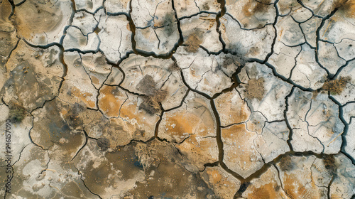 Aerial perspective of cracked earth in a dry lakebed, with geometric patterns formed by the parched ground, the cracks creating a striking natural abstract design