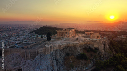 Aerial photo of iconic Masterpiece of Ancient world, Acropolis and the Parthenon at sunset with beautiful golden colours, Athens, Attica, Greece