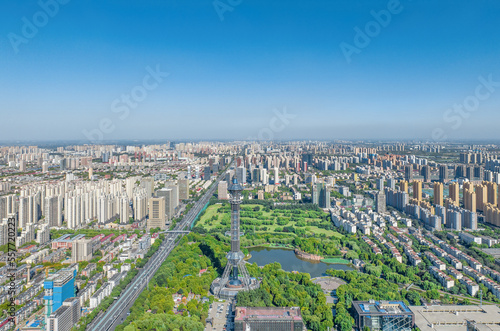 Aerial shot of Shijiazhuang TV Tower, Century Park and Golf Club, Shijiazhuang City, Hebei Province, China