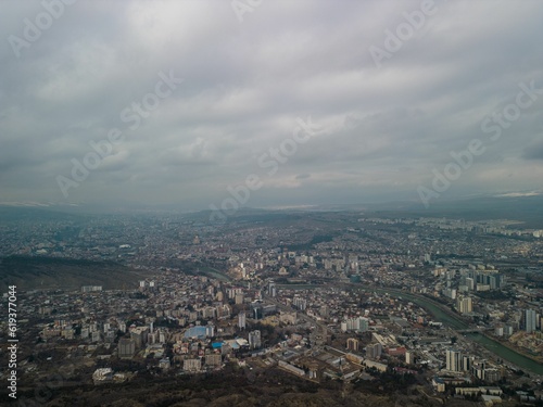 Aerial shot of the cityscape of Tbilisi, Georgia with buildings against a clouded sky