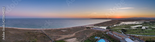 Aerial sunset seascape of Salgados beach and lagoon in Albufeira, Algarve tourism destination region, Portugal.