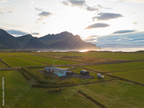 Aerial top view of houses or hotel with mountains in Iceland islands in the summer season, Europe hills, nature landscape background.