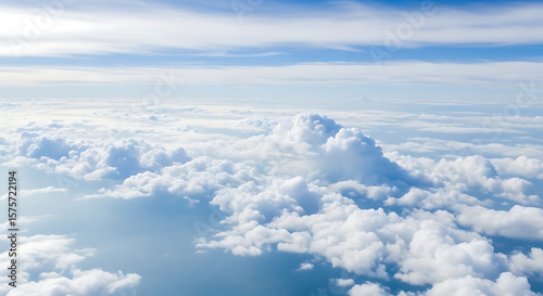 Aerial view above the clouds with a bright blue sky, fluffy white cloudscape stretching to the horizon, peaceful and serene atmosphere, soft lighting, natural sky scene
