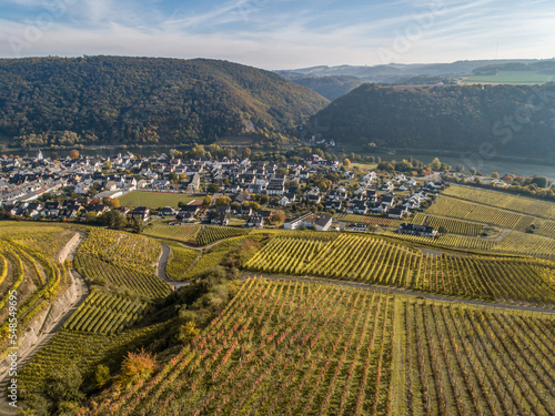 Aerial view Famous German Wine Region Moselle River Lay and Guels village Autumn Fall colors