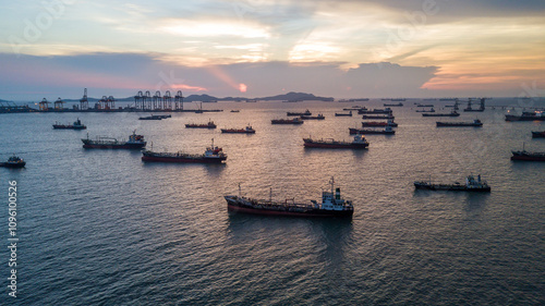 Aerial view industrial oil and gas tanker ship transportation logistic oil and gas refinery, Industrial oil and gas tanker ship global business logistic transportation refinery.