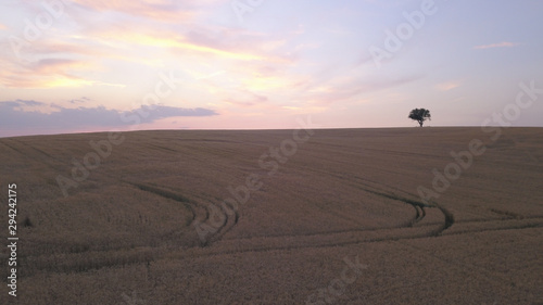 Aerial view of a Agricultural fields at sunset or sunrise in Europe. Drone shot