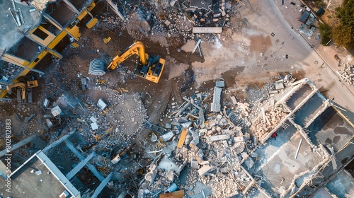 Aerial view of a demolition site, close-up on the main building being dismantled, detailed debris