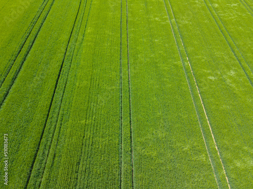 aerial view, growing, wheatfield, spring, cereal, field, farmland, farm, cultivation, countryside, up high, aerial, agricultural, agriculture, arable, background, birds eye view, country, cultivate, farming, flying, food, fresh, german, green, grow, growth, height, land, landscape, line, line, natural, nature, outside, pattern, plant, plantation, rural, season, sunny, top, topview, young