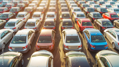 Aerial view of a large parking lot filled with rows of various colored cars under the bright sunlight of a clear day. Urban transportation scene.