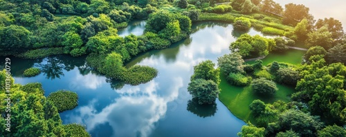 aerial, view, lush, botanical, garden, surround, water, bright, sky, reflect, tropical, sculpture, sunshine, floral, aquatic, beauty, lifestyle, travel, botany, viewpoint, wildflower, scenery, canopy, pathway, culture, landform, greenery, scenic, habitat, coastal, heavenly, footpath, wildlife, journey, retreat, meander, jungle, wellness, seasonal, delight