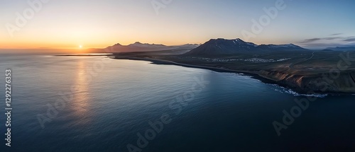 Aerial view of a picturesque road in Iceland, showcasing stunning natural landscapes with mountains and coastline illuminated by the sunset.