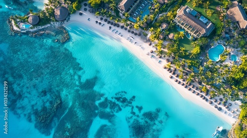Aerial view of a tropical beach paradise with turquoise waters.