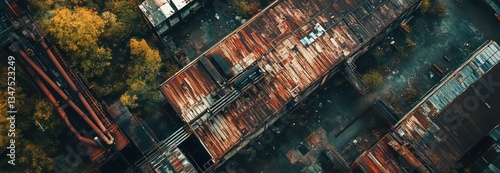 Aerial View of Abandoned Industrial Site with Decaying Structures and Rusty Machinery