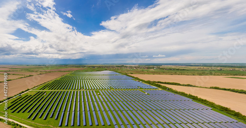 Aerial view of big sustainable electric power plant with many rows of solar photovoltaic panels for producing clean ecological electrical energy. Renewable electricity with zero emission concept