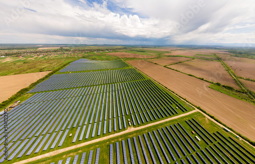 Aerial view of big sustainable electric power plant with many rows of solar photovoltaic panels for producing clean ecological electrical energy. Renewable electricity with zero emission concept