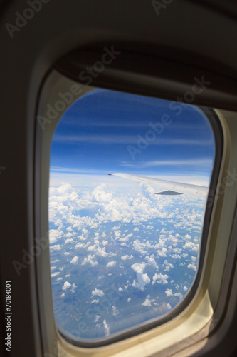 aerial view of blue sky with clouds from window of jet flight