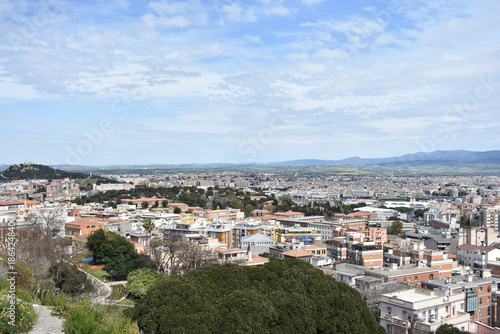 Aerial view of Cagliari, Sardinia, Italy. Colorful buildings and greenery contrast with distant mountains. Holidays in Sardegna. Travel to Italy. Travel and tourism concept.