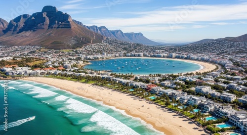 africa, ocean, beach, city, aerial, view, coastline, harbor, boat, water, wave, sand, shore, sea, tropical, summer, vacation, holiday, travel, tour tourism, scenic, beautiful, vibrant, blue, green, white, urban, landscape, nature, mountain, hillside, building, house, residential, palm, tree, vegetation, clear, sky, daylight, sunny, bright, horizon, panorama, exotic, destination