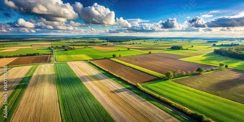 Aerial View of Cultivated Farmland Showing Diverse Crops Under a Partly Cloudy Sky