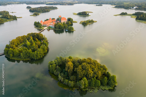 up high, aerial, ancient, architecture, background, baltic, beautiful, blue, building, castle, culture, destination, drone, europa, exterior, green, historic, historical, island, lake, landmark, landscape, lithuania, mediaeval, morning, nature, red, romantic, sky, summer, sunny, traditional, trakai, travel, view, water