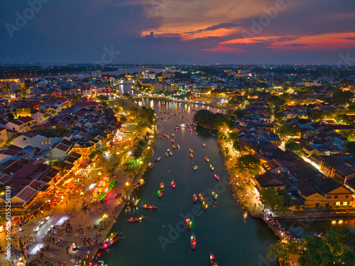 Aerial view of Hoi An old town or Hoian ancient town in evening. Royalty high-quality free stock image top of Hoai river and boat tour night traffic. One of the most popular touristic destination