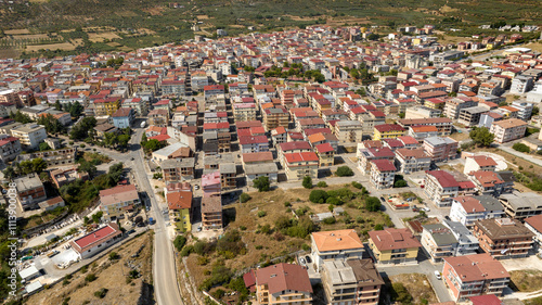 Aerial view of houses, apartments and buildings of the town of Cagnano Varano located in the province of Foggia, in Gargano, Puglia, Italy.